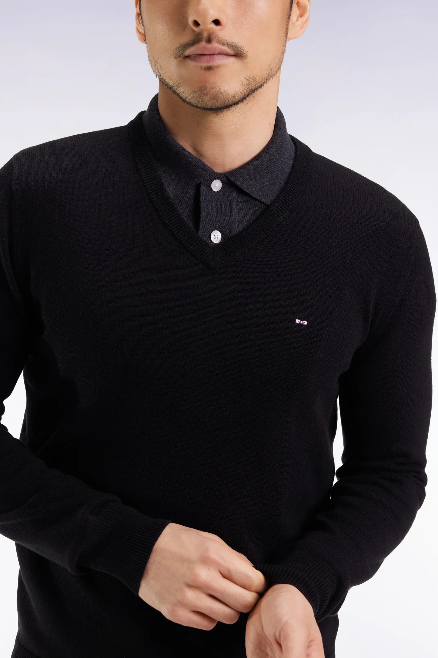- Cet élégant pull col V en laine et coton mélangés reprend la coupe droite confortable et polyvalente de notre pull classique décliné dans plusieurs propositions se distinguant par leur encolure. Ce modèle se pare de notre emblématique broderie nœud papillon sur la poitrine et d’une demi-lune intérieure à rayures rugby. Parfait pour dynamiser une silhouette avec une touche de couleur maîtrisée grâce au large choix de coloris proposés ici