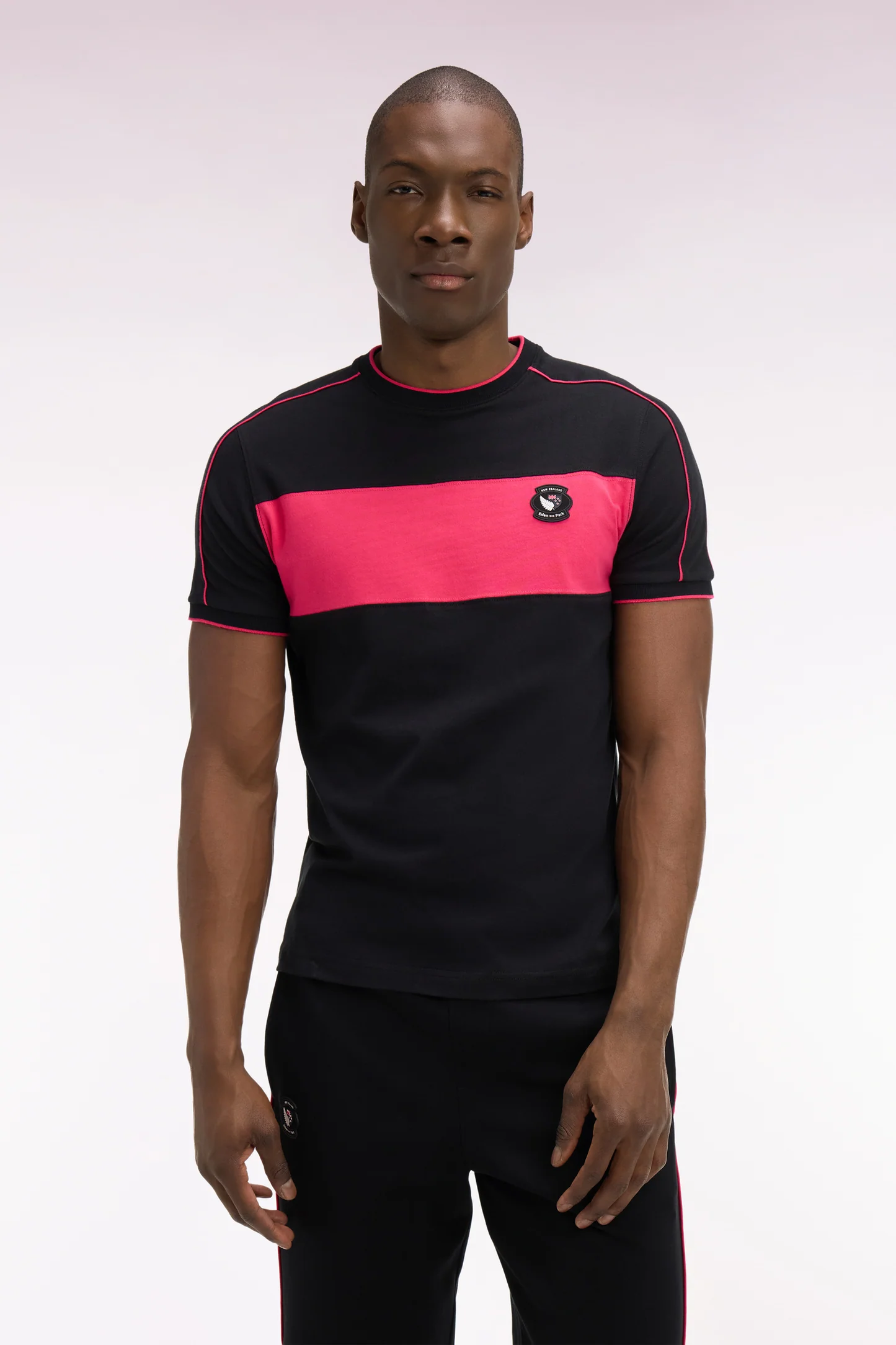 Ce T-shirt homme de notre capsule New Zealand est confectionné en jersey de coton blanc ou noir et se distingue par ses découpes et passepoils contrastés, noirs ou fuchsia selon le coloris choisi, et son badge sur la poitrine. Ses finitions bords-côtes rayées affirment son style sport-chic emblématique de nos créations.